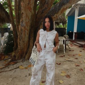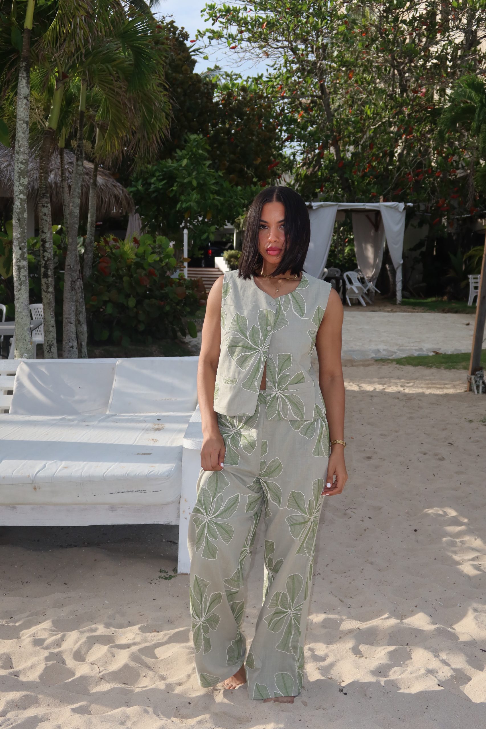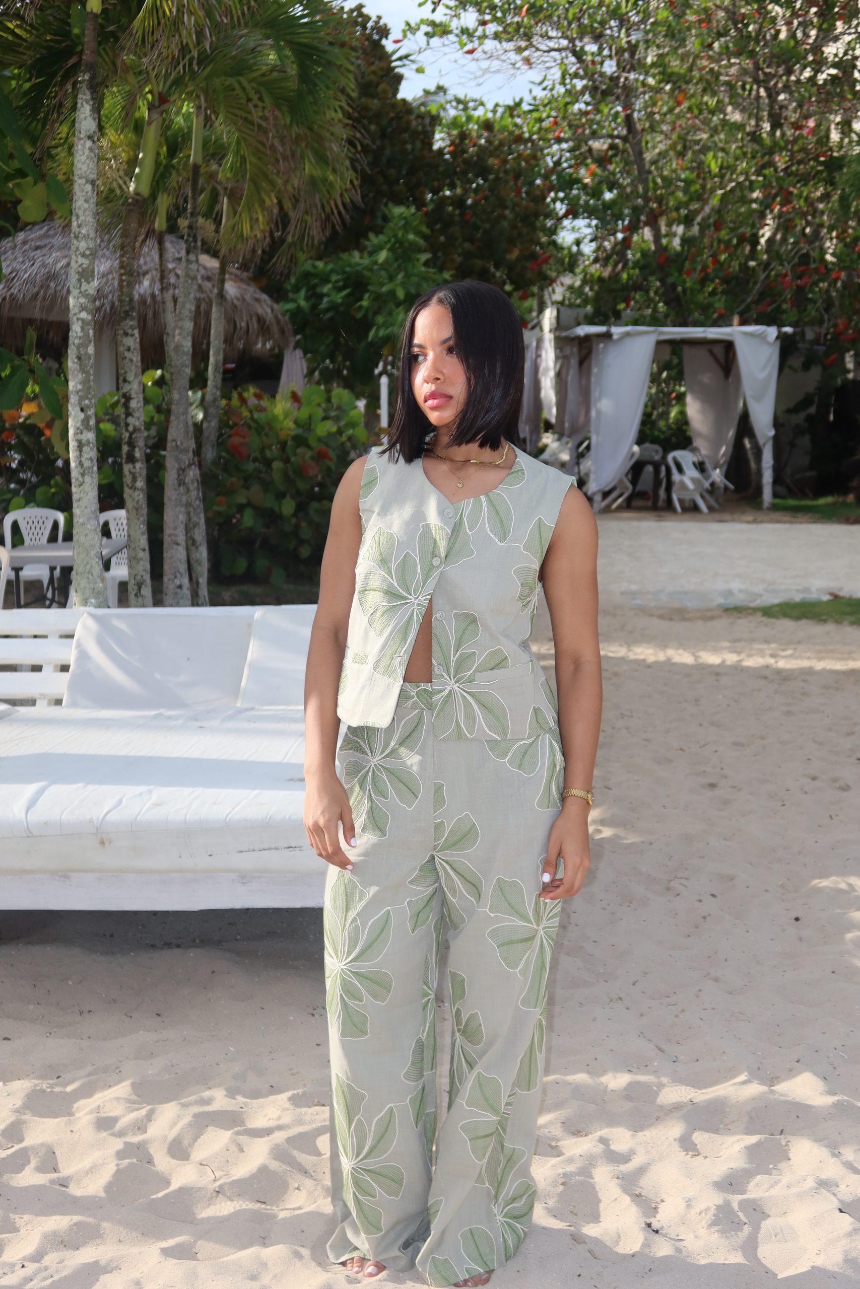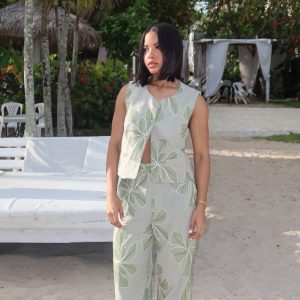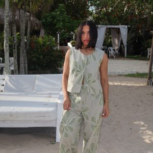 Set verde bohemio con detalles artesanales.