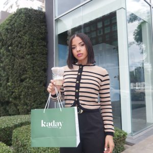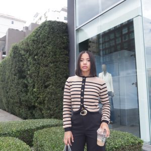 Cardigan marrón con rayas negras y botones dorados.