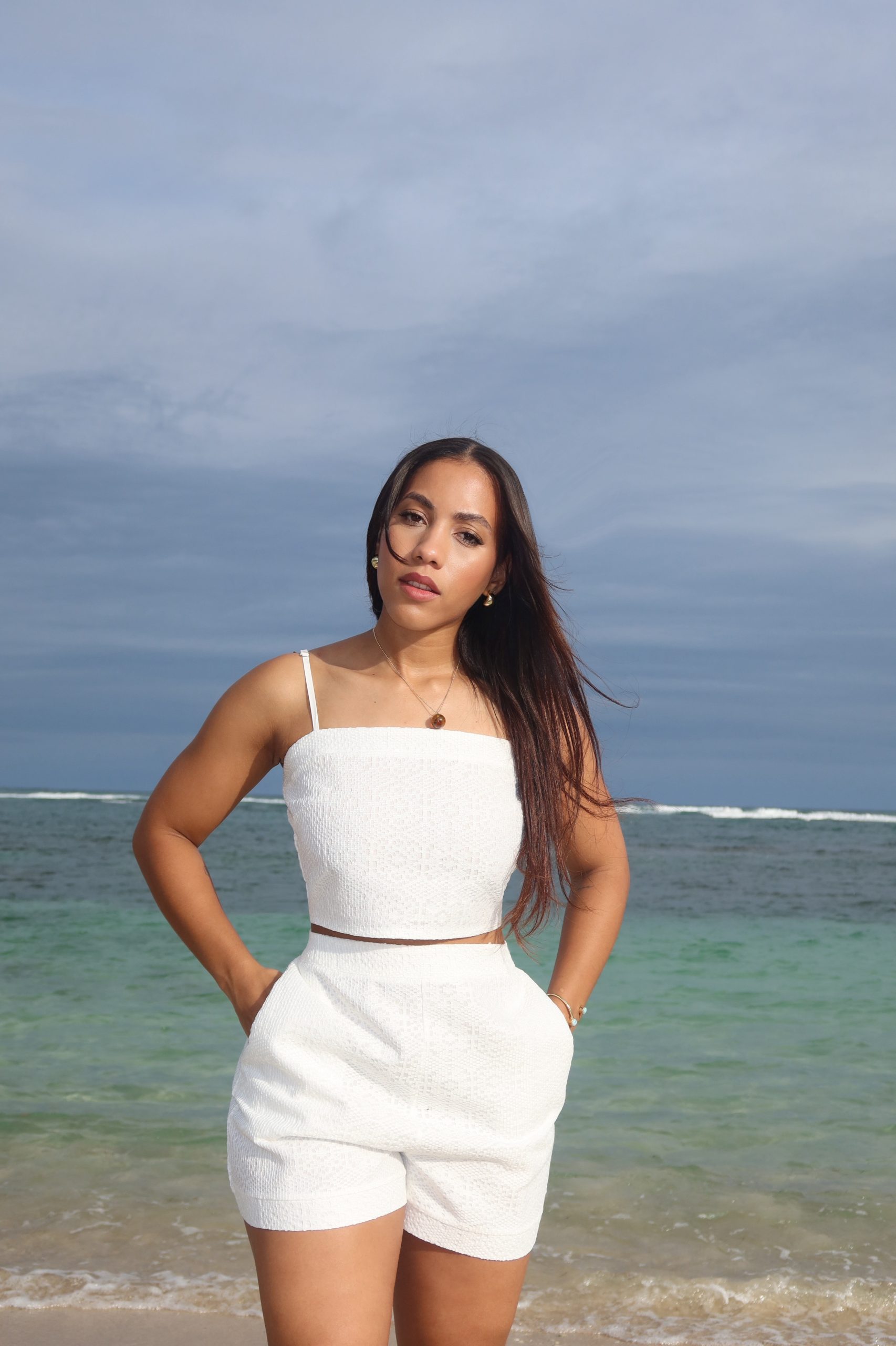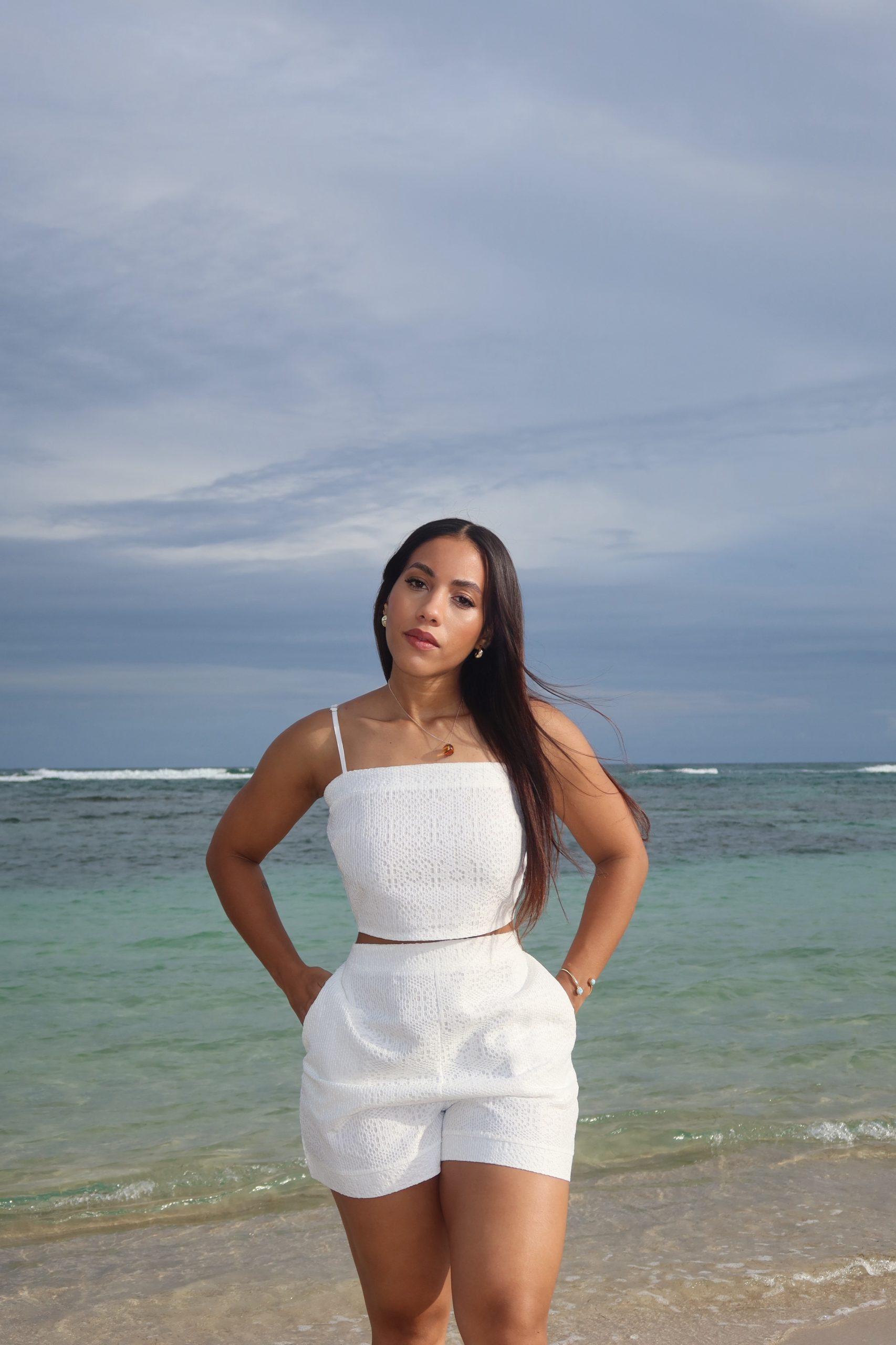 El Cava Set es frescura pura con textura: un conjunto blanco y corto que combina comodidad, estilo y ese toque chic que va con todo.
