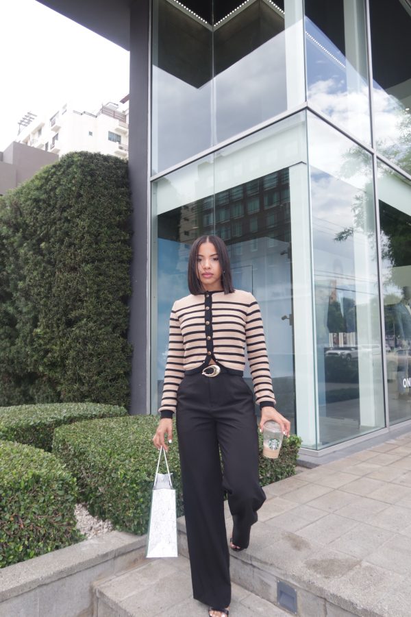 Pantalón negro corte recto, piernas largas y estilo formal.