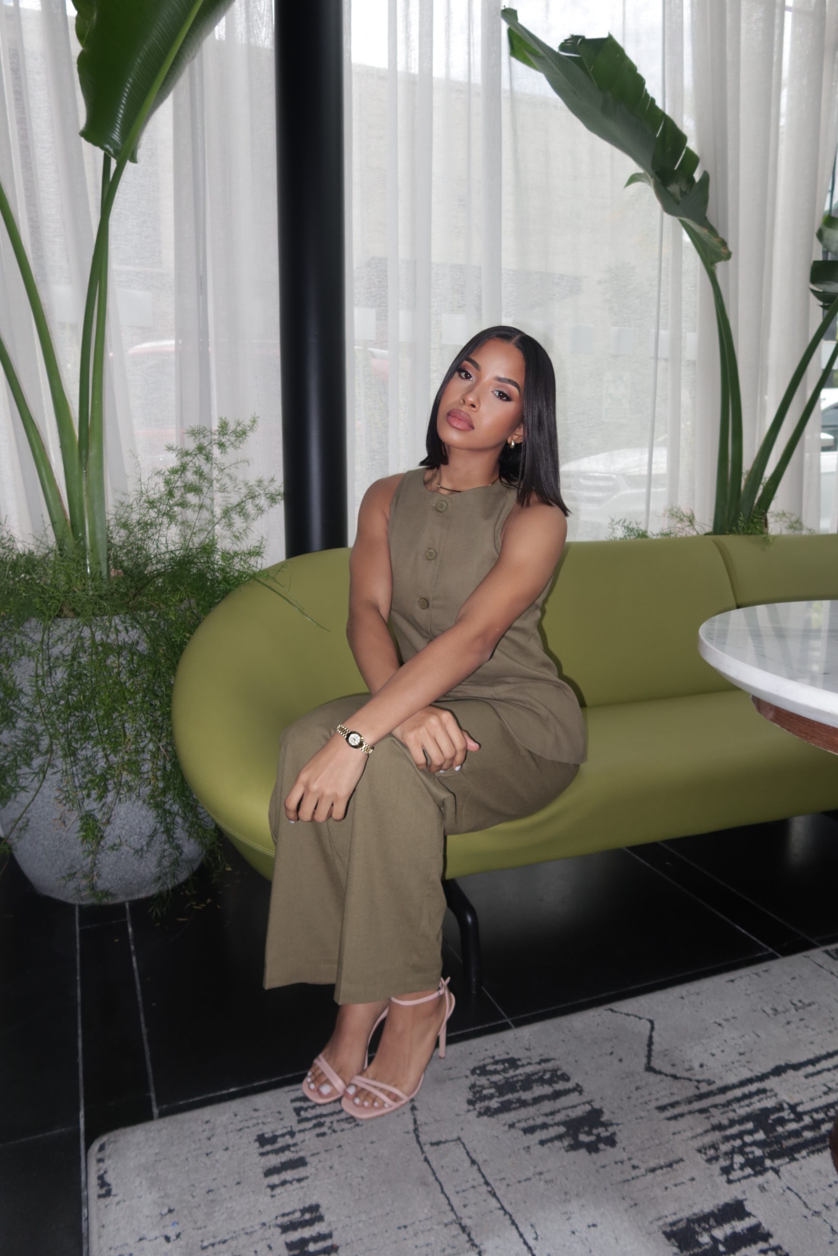 Pantalón relaxed-fit en lino verde olivo.
