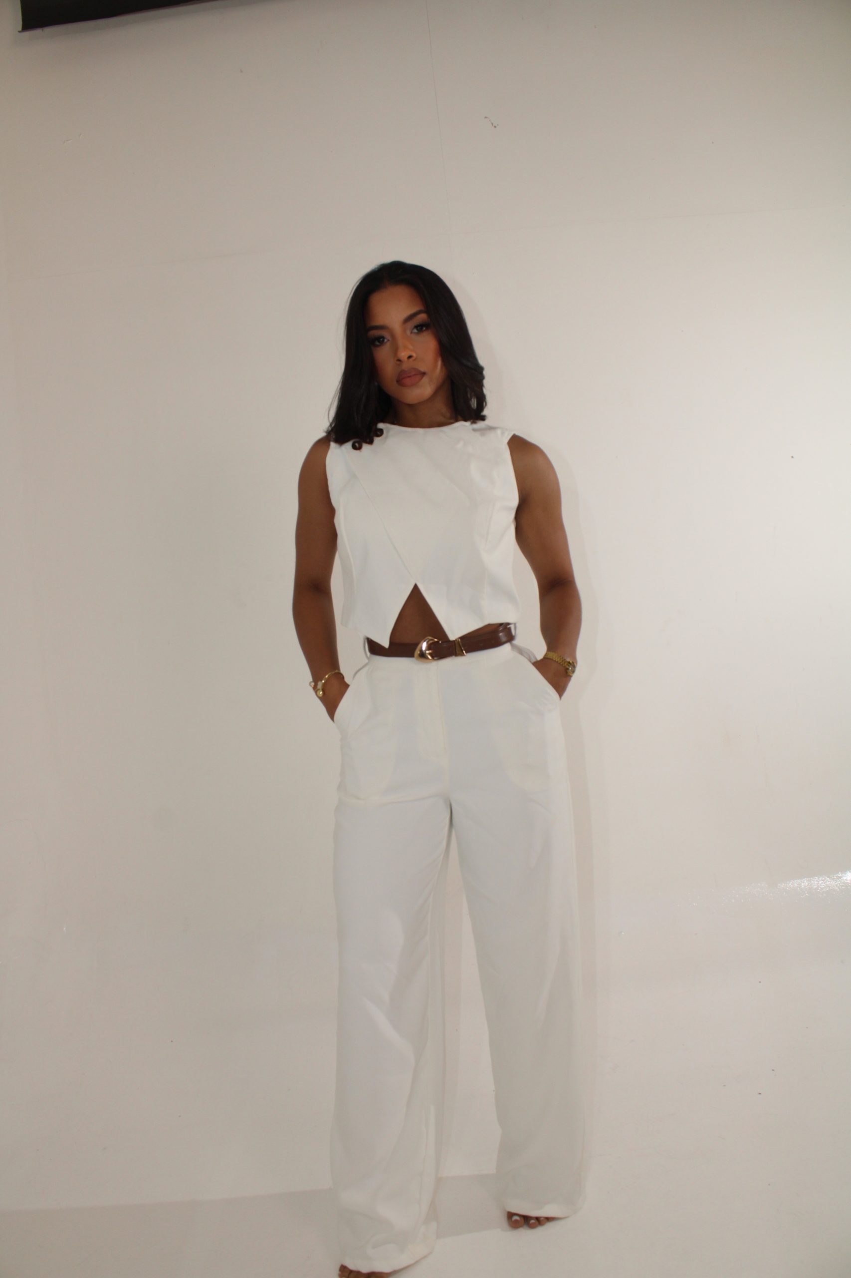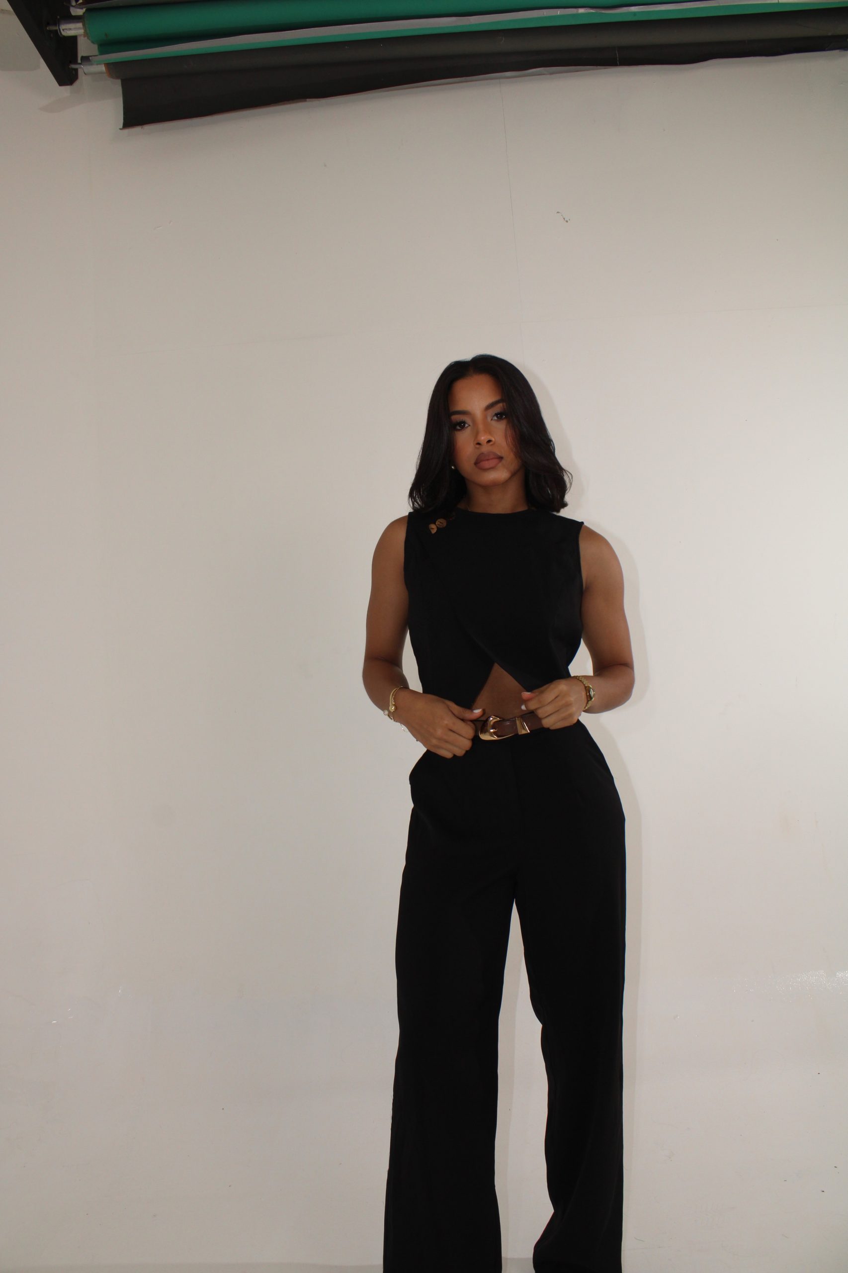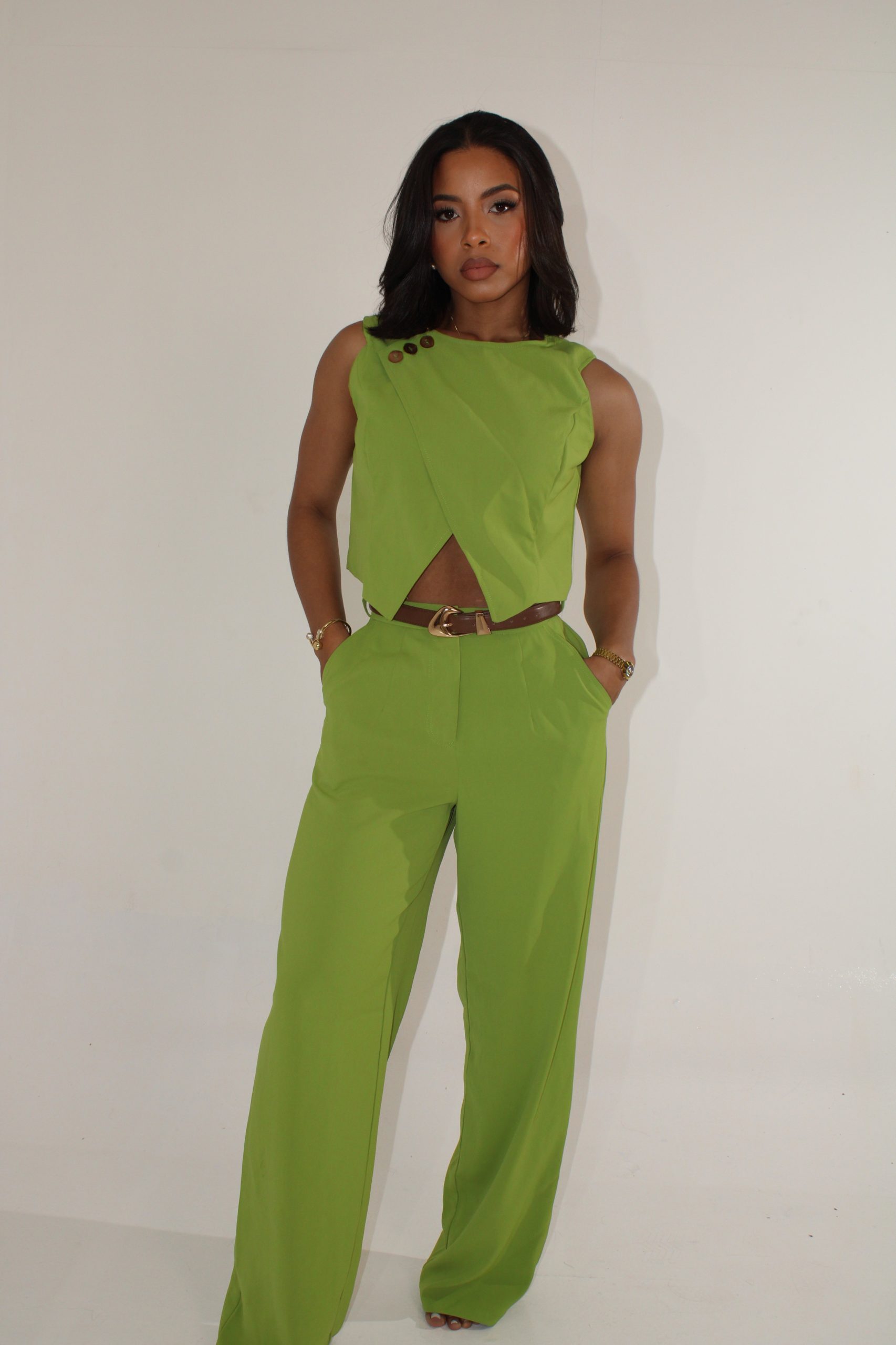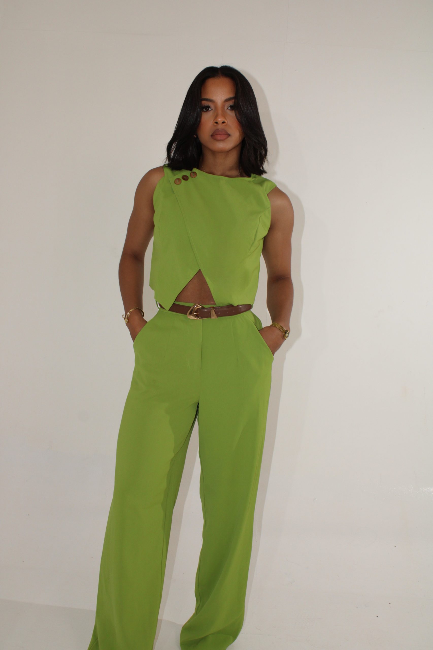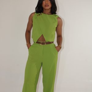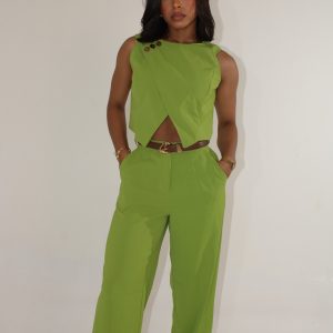 Set verde con pantalón fluido y top con botones dorados.