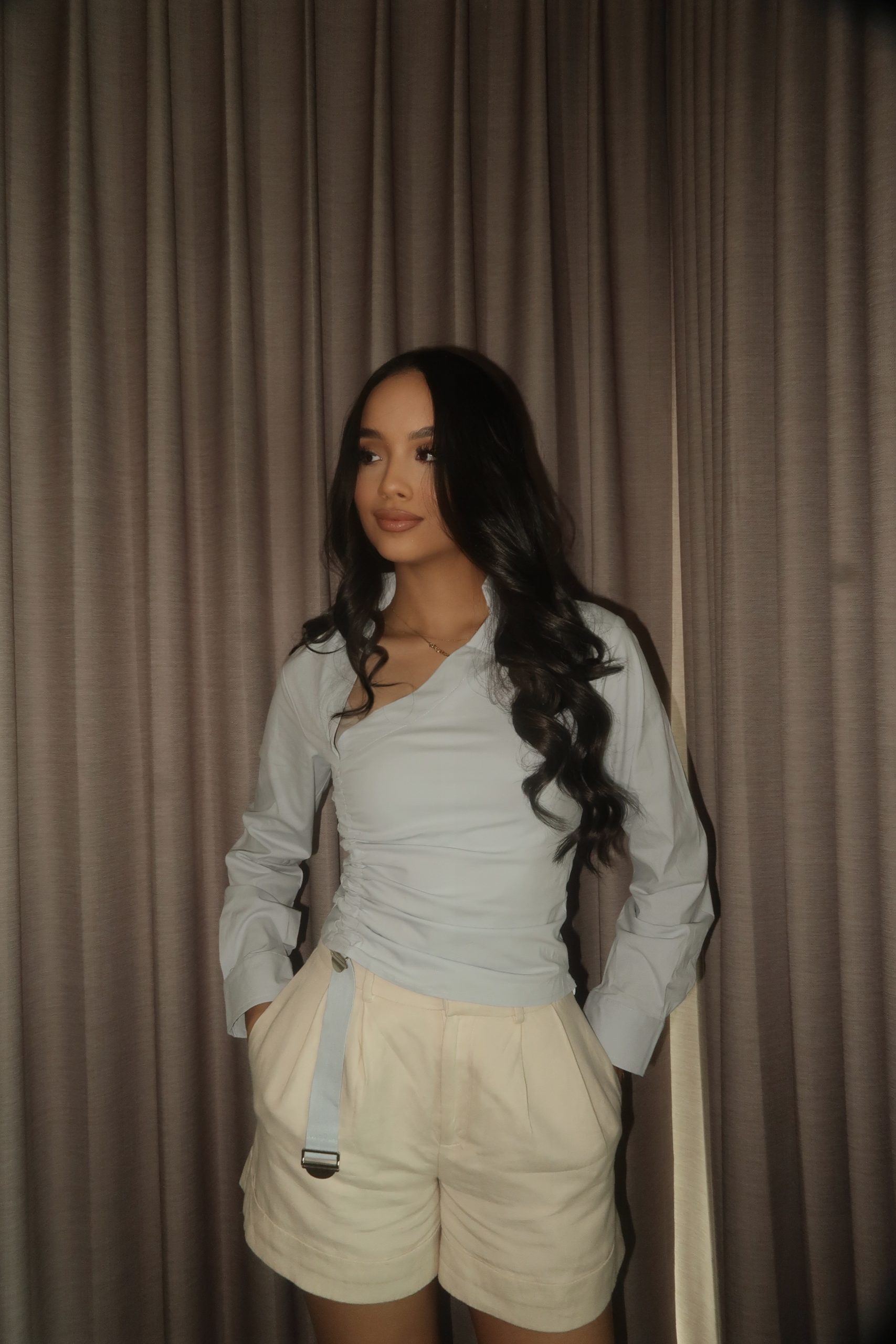 Camisa azul ajustable con zipper lateral.